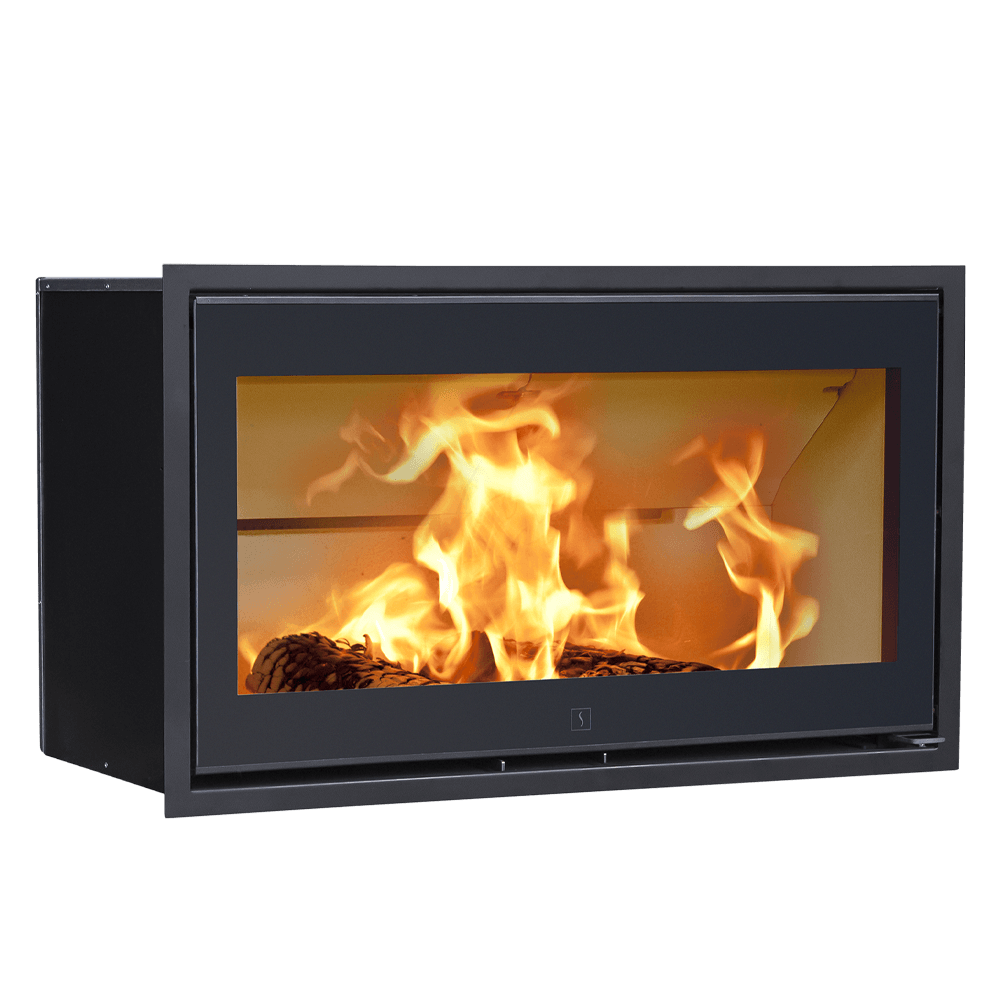 Questo inserto a legna di formato panoramico ha una camera di combustione larga 100 cm, che offre un'ampia vista delle fiamme. Il suo design elegante, con telaio in acciaio nero, finestra serigrafata nera e camera di combustione in refrattario, gli permette di adattarsi a tutti gli stili di interni. Questo inserto a legna può ospitare ceppi fino a 80 cm.