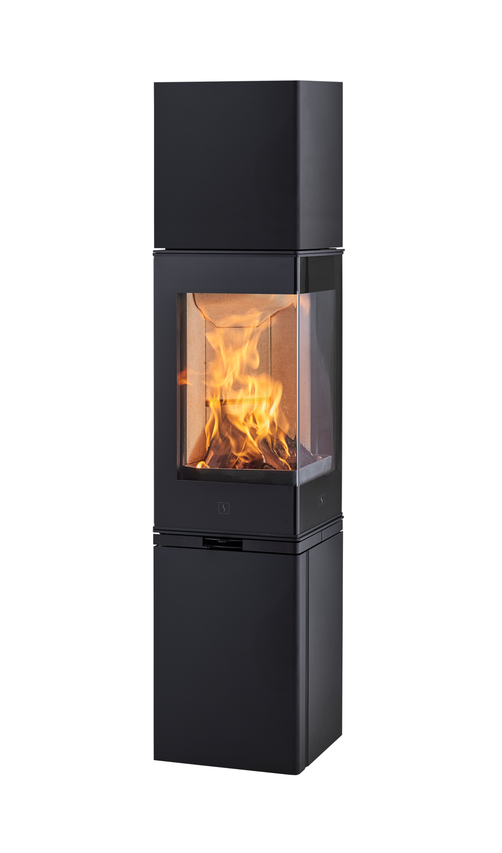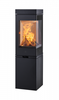 Scan 80-4, è dotata di un pratico sportello nella base, dove è possibile alloggiare la legna. Se la stufa, viene installata in un angolo, è disponibile un Top speciale con l'uscita fumi laterale e in due colorazioni: verniciata nera o verniciata bianca.
